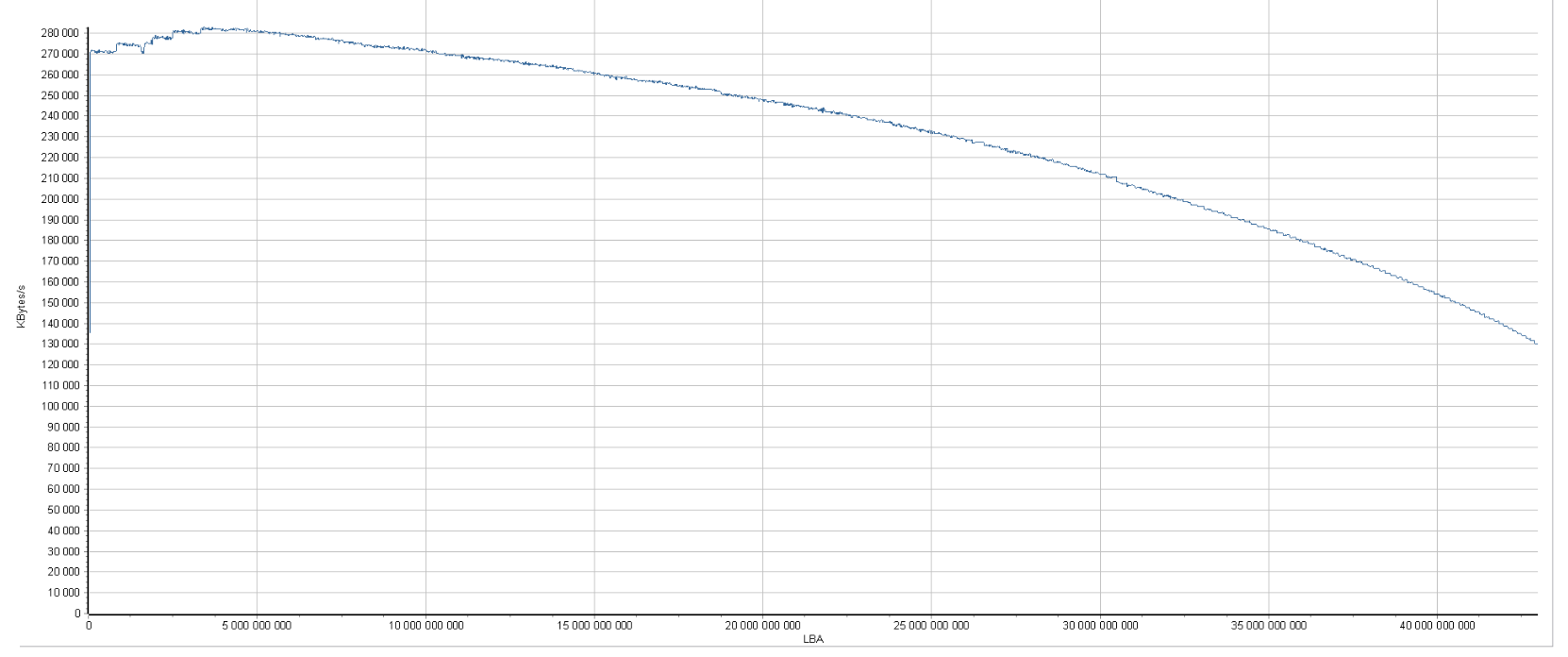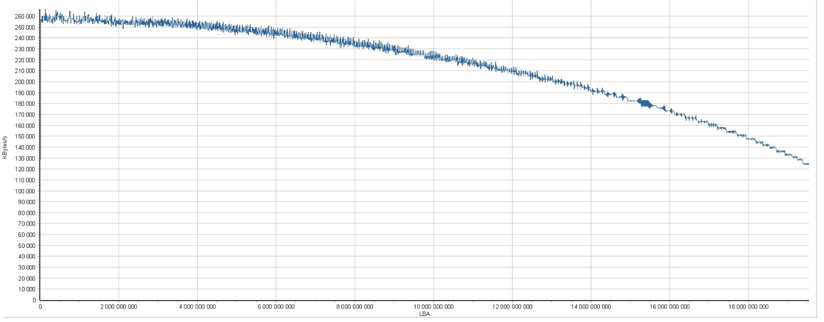 Ниибически огромный и быстрый диск на гелии. Очень интересный график - какого-то хрена в начале растёт, никогда такого не видел. Как он в реальной работе, кстати, до сих пор не знаю. После теста я его положил на полку и пока не ставлю. Не сильно и нужен тащемта, после установки двух предыдущих и так свободного места завались.